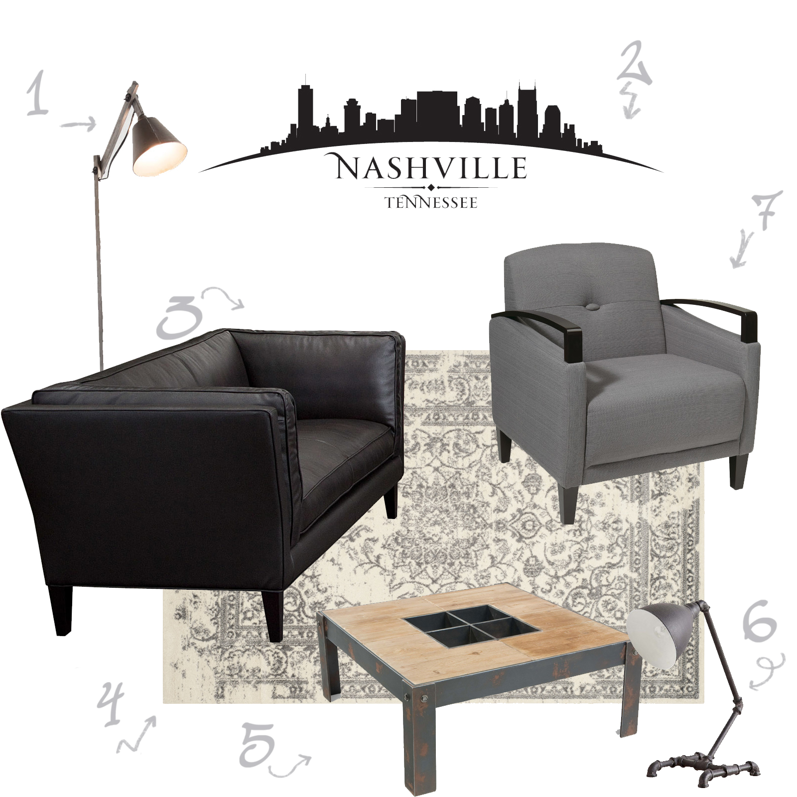 I came up with the following launching point as a concept and I am digging it to be honest. I am really loving the budget. I am UNDER $2,500 which is pretty impressive considering the prices I was seeing for product lines that fit with industrial goal. Toss in a couple throw pillows on that love seat and I think it’s pretty golden.